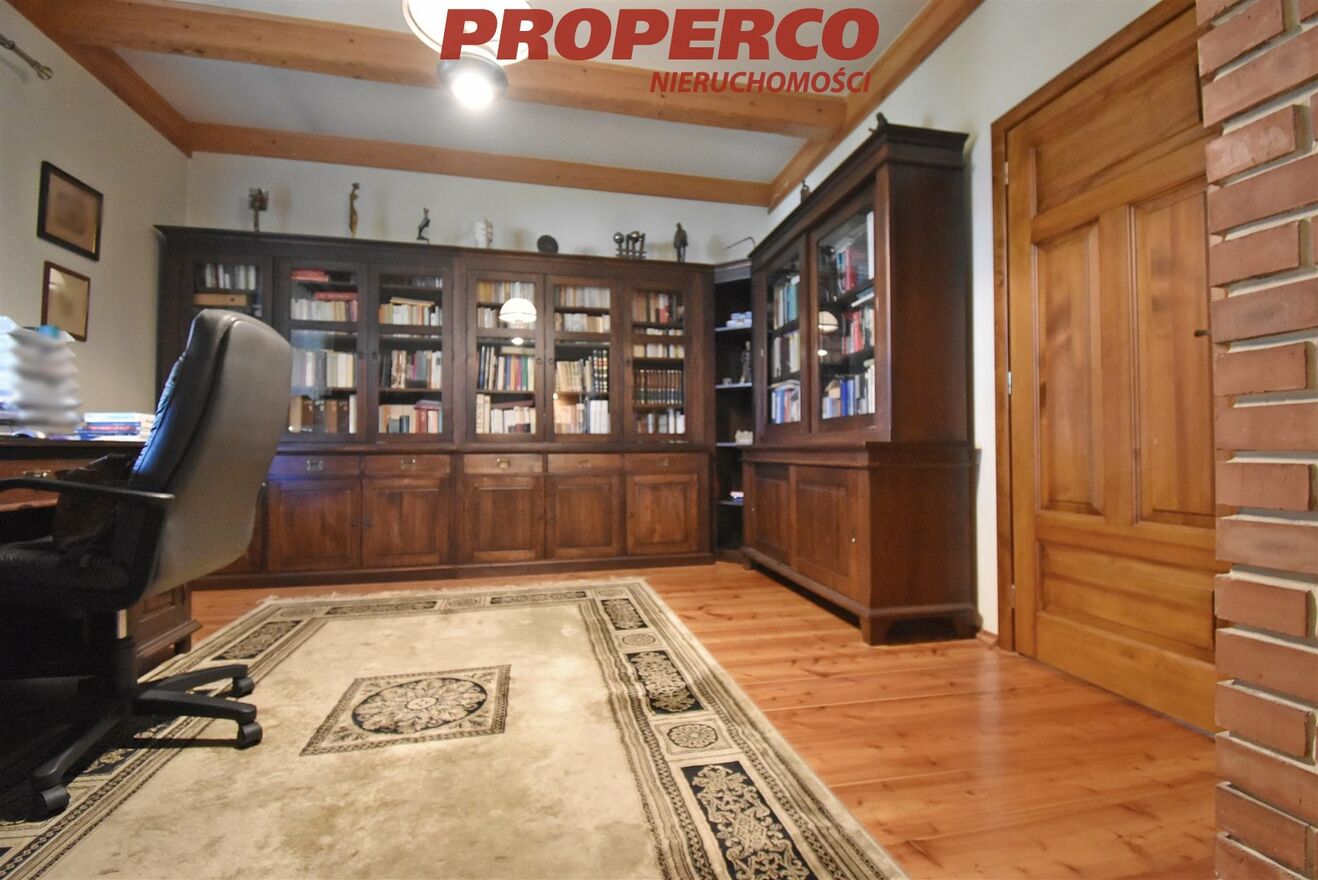 The property is located among single-family houses in an attractive and quiet area, with views of the Świętokrzyskie Mountains panorama. The plot is varied, sloped, fenced, and well maintained, with mature plantings. The driveway to the garage is paved with stone setts. The house lies on the slope of the Wilkowska Valley (south-eastern exposure) and is surrounded by pine, birch, and fir forest. In the lower part of the valley there is a reservoir with a beach and a ski lift. Nearby attractions include rock outcrops, a wild garlic meadow, and natural water springs.